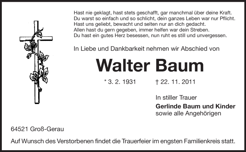 Hier finden Sie alle Traueranzeigen aus der Zeitung, die bisher für Walter Baum erschienen sind. Weitere Traueranzeigen, die in der Zeitung erscheinen, werden hier ebenfalls aufgelistet