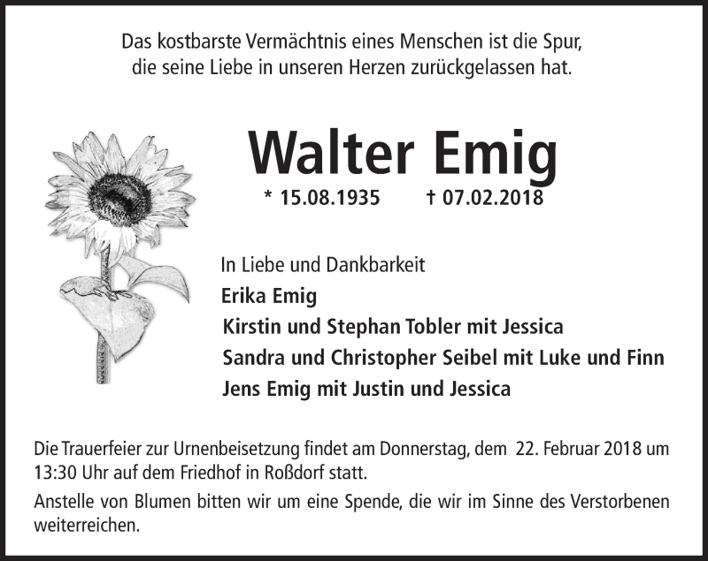 Hier finden Sie alle Traueranzeigen aus der Zeitung, die bisher für Walter Emig erschienen sind. Weitere Traueranzeigen, die in der Zeitung erscheinen, werden hier ebenfalls aufgelistet