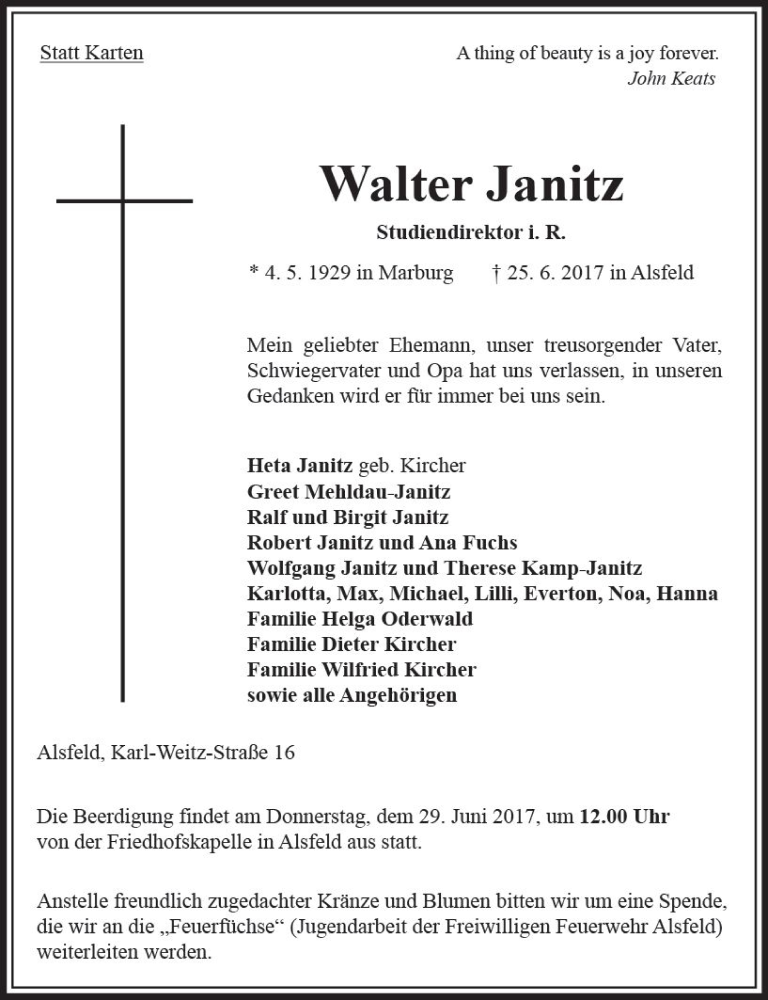 Hier finden Sie alle Traueranzeigen aus der Zeitung, die bisher für Walter Janitz erschienen sind. Weitere Traueranzeigen, die in der Zeitung erscheinen, werden hier ebenfalls aufgelistet