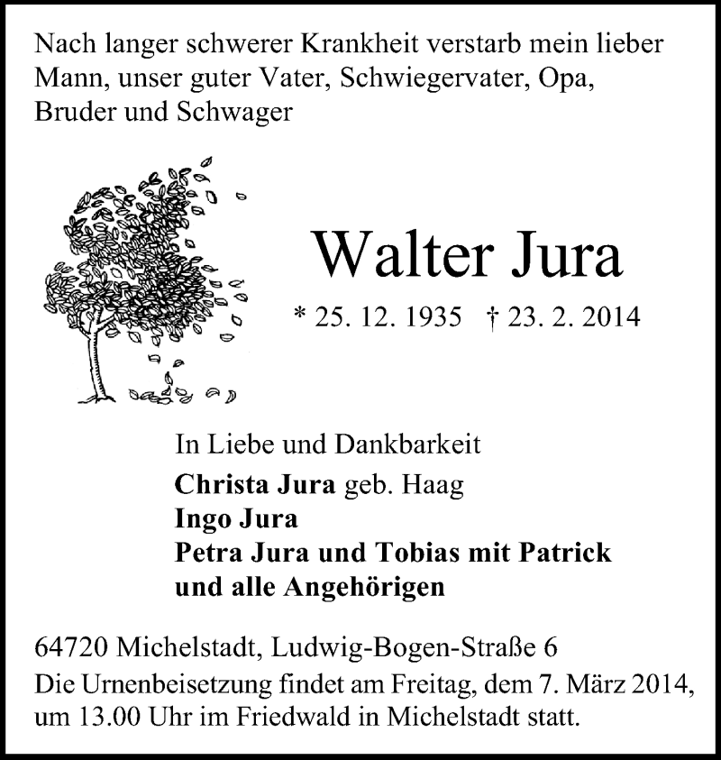 Hier finden Sie alle Traueranzeigen aus der Zeitung, die bisher für Walter Jura erschienen sind. Weitere Traueranzeigen, die in der Zeitung erscheinen, werden hier ebenfalls aufgelistet