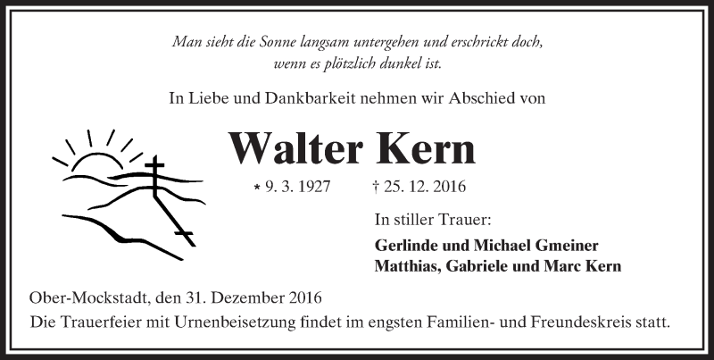 Hier finden Sie alle Traueranzeigen aus der Zeitung, die bisher für Walter Kern erschienen sind. Weitere Traueranzeigen, die in der Zeitung erscheinen, werden hier ebenfalls aufgelistet