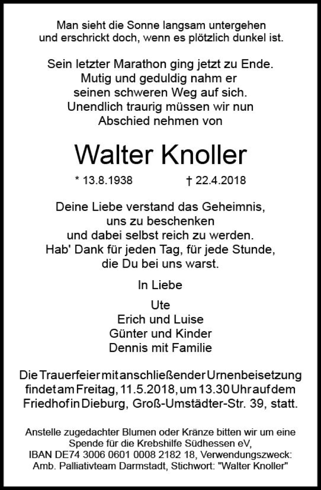 Hier finden Sie alle Traueranzeigen aus der Zeitung, die bisher für Walter Knoller erschienen sind. Weitere Traueranzeigen, die in der Zeitung erscheinen, werden hier ebenfalls aufgelistet