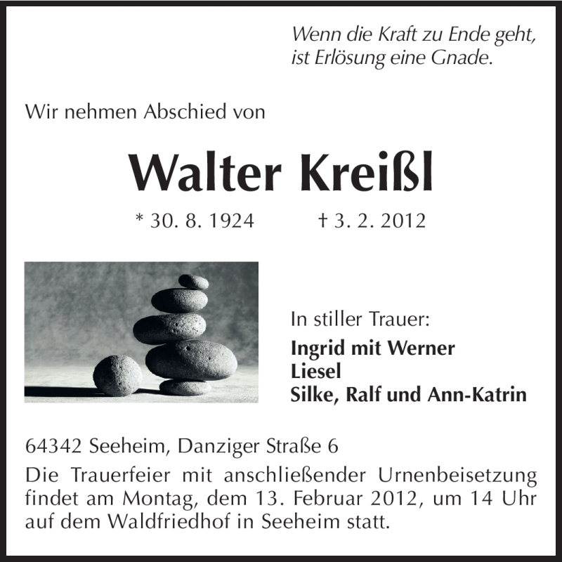 Hier finden Sie alle Traueranzeigen aus der Zeitung, die bisher für Walter Kreißl erschienen sind. Weitere Traueranzeigen, die in der Zeitung erscheinen, werden hier ebenfalls aufgelistet
