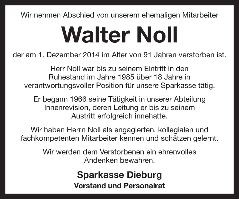 Hier finden Sie alle Traueranzeigen aus der Zeitung, die bisher für Walter Noll erschienen sind. Weitere Traueranzeigen, die in der Zeitung erscheinen, werden hier ebenfalls aufgelistet