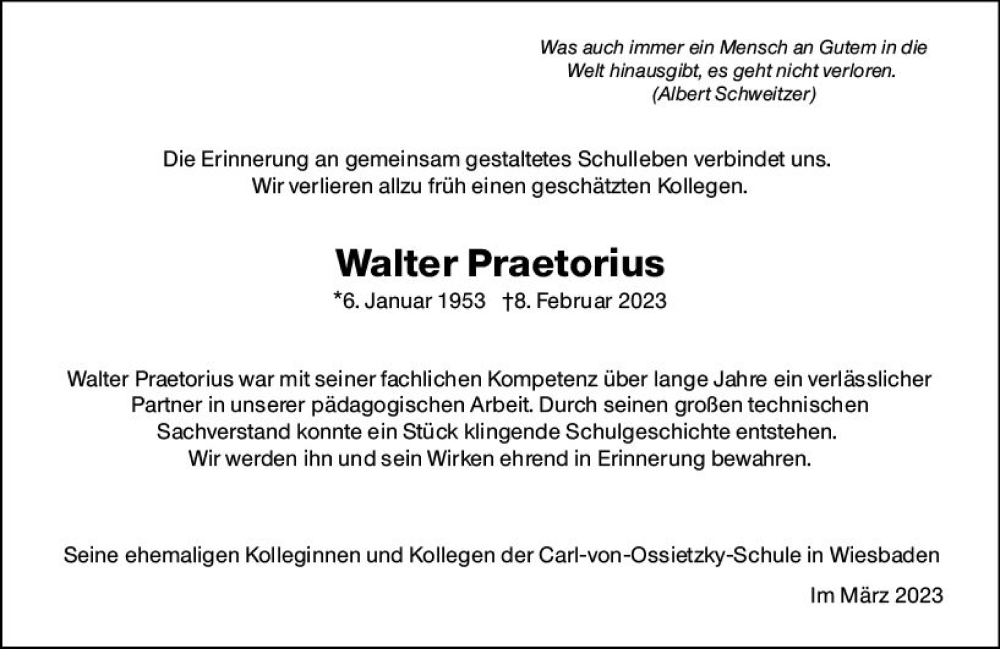 Hier finden Sie alle Traueranzeigen aus der Zeitung, die bisher für Walter Praetorius erschienen sind. Weitere Traueranzeigen, die in der Zeitung erscheinen, werden hier ebenfalls aufgelistet
