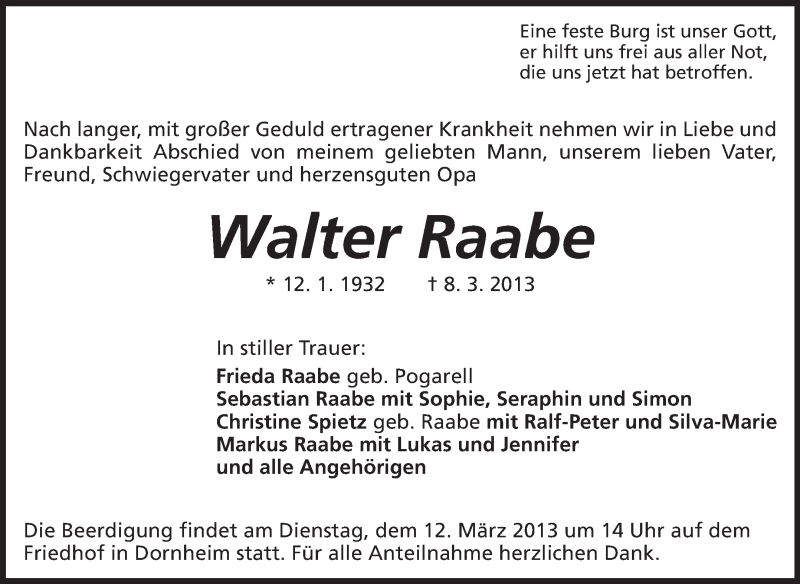 Hier finden Sie alle Traueranzeigen aus der Zeitung, die bisher für Walter Raabe erschienen sind. Weitere Traueranzeigen, die in der Zeitung erscheinen, werden hier ebenfalls aufgelistet