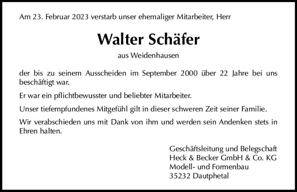Hier finden Sie alle Traueranzeigen aus der Zeitung, die bisher für Walter Schäfer erschienen sind. Weitere Traueranzeigen, die in der Zeitung erscheinen, werden hier ebenfalls aufgelistet