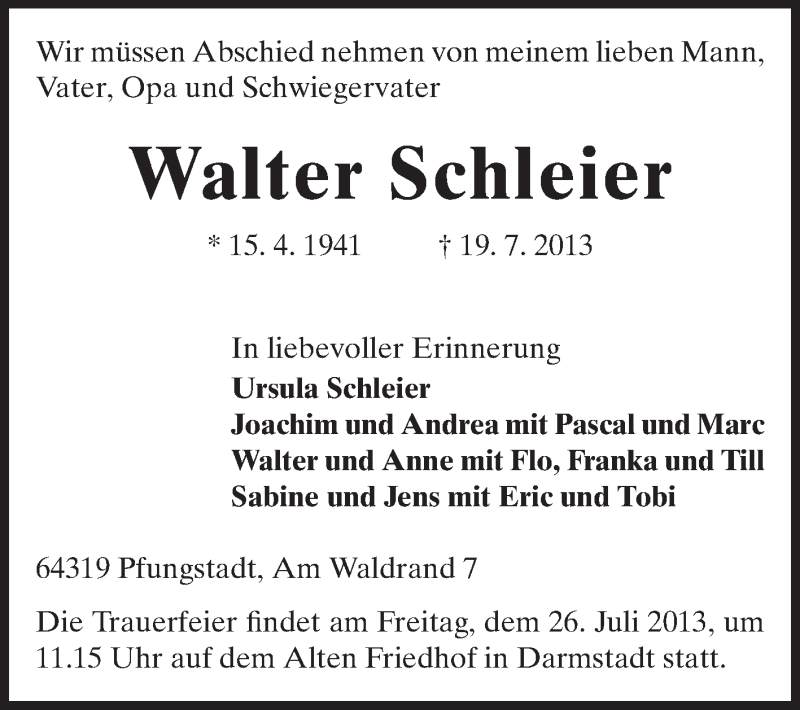 Hier finden Sie alle Traueranzeigen aus der Zeitung, die bisher für Walter Schleier erschienen sind. Weitere Traueranzeigen, die in der Zeitung erscheinen, werden hier ebenfalls aufgelistet