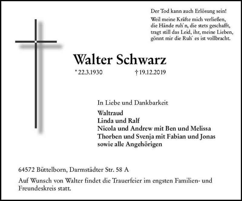 Hier finden Sie alle Traueranzeigen aus der Zeitung, die bisher für Walter Schwarz erschienen sind. Weitere Traueranzeigen, die in der Zeitung erscheinen, werden hier ebenfalls aufgelistet