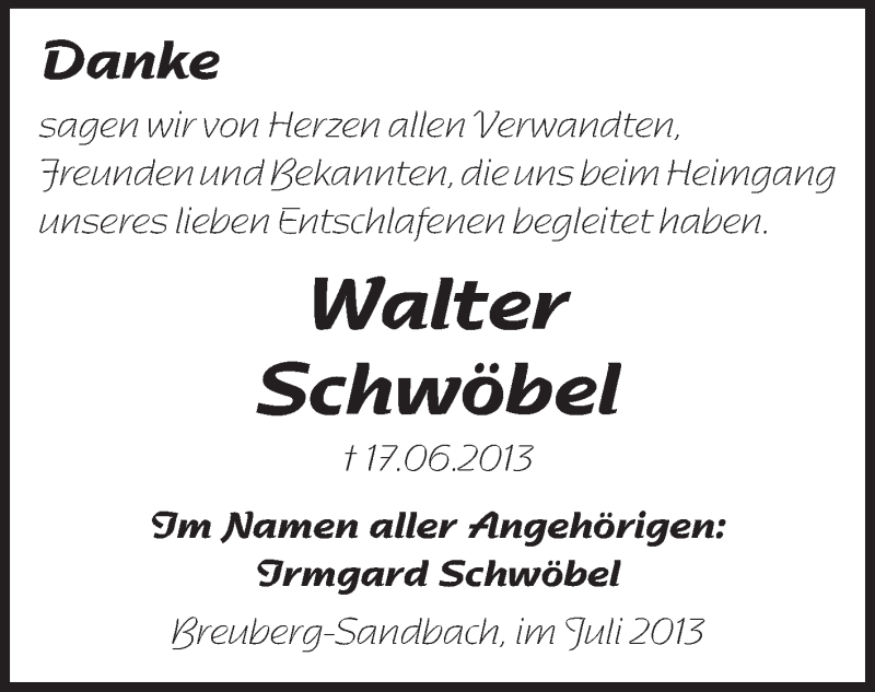 Hier finden Sie alle Traueranzeigen aus der Zeitung, die bisher für Walter Schwöbel erschienen sind. Weitere Traueranzeigen, die in der Zeitung erscheinen, werden hier ebenfalls aufgelistet