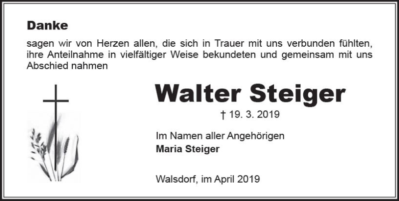 Hier finden Sie alle Traueranzeigen aus der Zeitung, die bisher für Walter Steiger erschienen sind. Weitere Traueranzeigen, die in der Zeitung erscheinen, werden hier ebenfalls aufgelistet