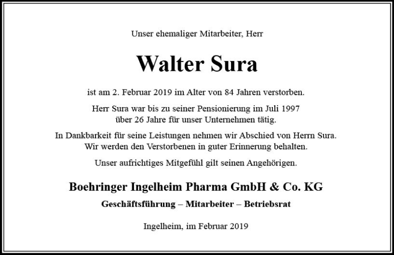Hier finden Sie alle Traueranzeigen aus der Zeitung, die bisher für Walter Sura erschienen sind. Weitere Traueranzeigen, die in der Zeitung erscheinen, werden hier ebenfalls aufgelistet
