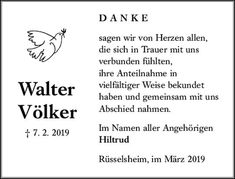 Hier finden Sie alle Traueranzeigen aus der Zeitung, die bisher für Walter Völker erschienen sind. Weitere Traueranzeigen, die in der Zeitung erscheinen, werden hier ebenfalls aufgelistet