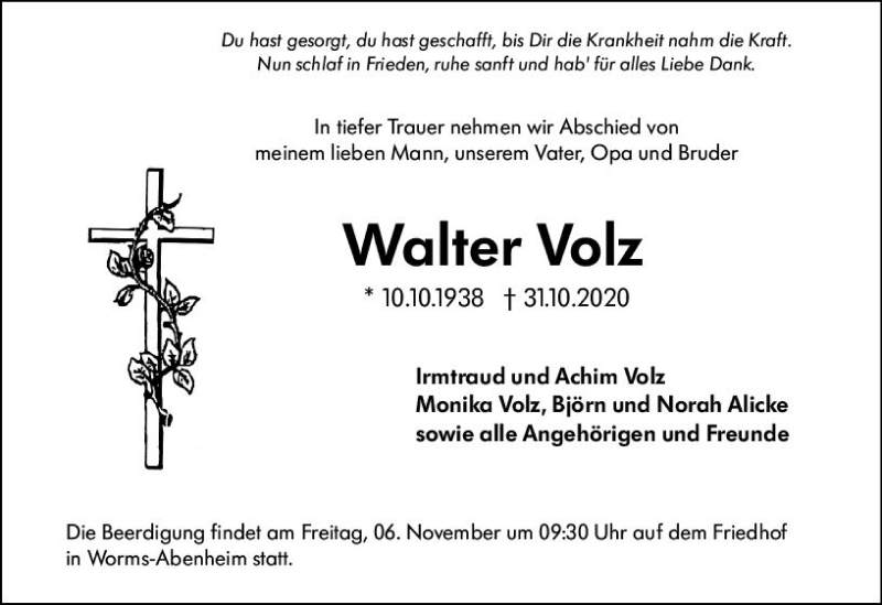 Hier finden Sie alle Traueranzeigen aus der Zeitung, die bisher für Walter Volz erschienen sind. Weitere Traueranzeigen, die in der Zeitung erscheinen, werden hier ebenfalls aufgelistet