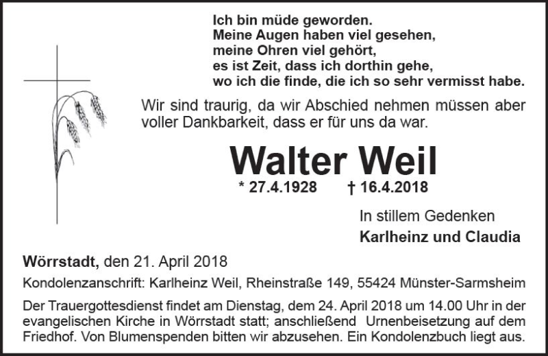 Hier finden Sie alle Traueranzeigen aus der Zeitung, die bisher für Walter Weil erschienen sind. Weitere Traueranzeigen, die in der Zeitung erscheinen, werden hier ebenfalls aufgelistet