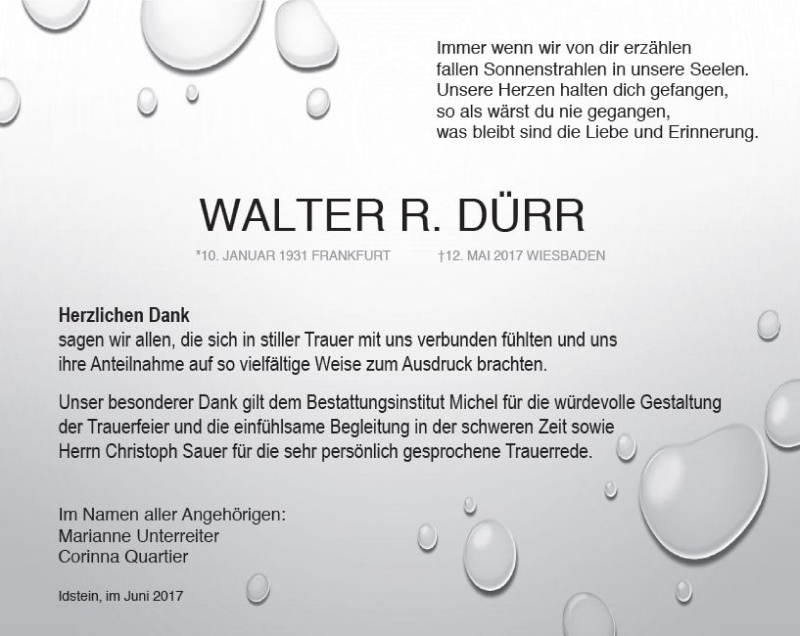 Hier finden Sie alle Traueranzeigen aus der Zeitung, die bisher für Walter R. Dürr erschienen sind. Weitere Traueranzeigen, die in der Zeitung erscheinen, werden hier ebenfalls aufgelistet