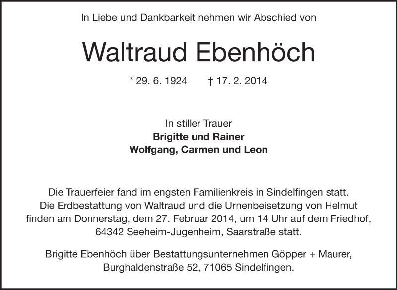 Hier finden Sie alle Traueranzeigen aus der Zeitung, die bisher für Waltraud Ebenhöch erschienen sind. Weitere Traueranzeigen, die in der Zeitung erscheinen, werden hier ebenfalls aufgelistet