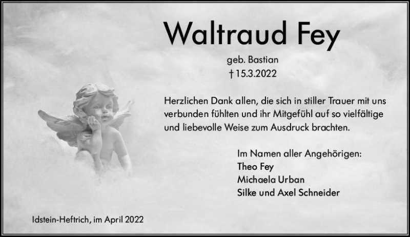 Hier finden Sie alle Traueranzeigen aus der Zeitung, die bisher für Waltraud Fey erschienen sind. Weitere Traueranzeigen, die in der Zeitung erscheinen, werden hier ebenfalls aufgelistet