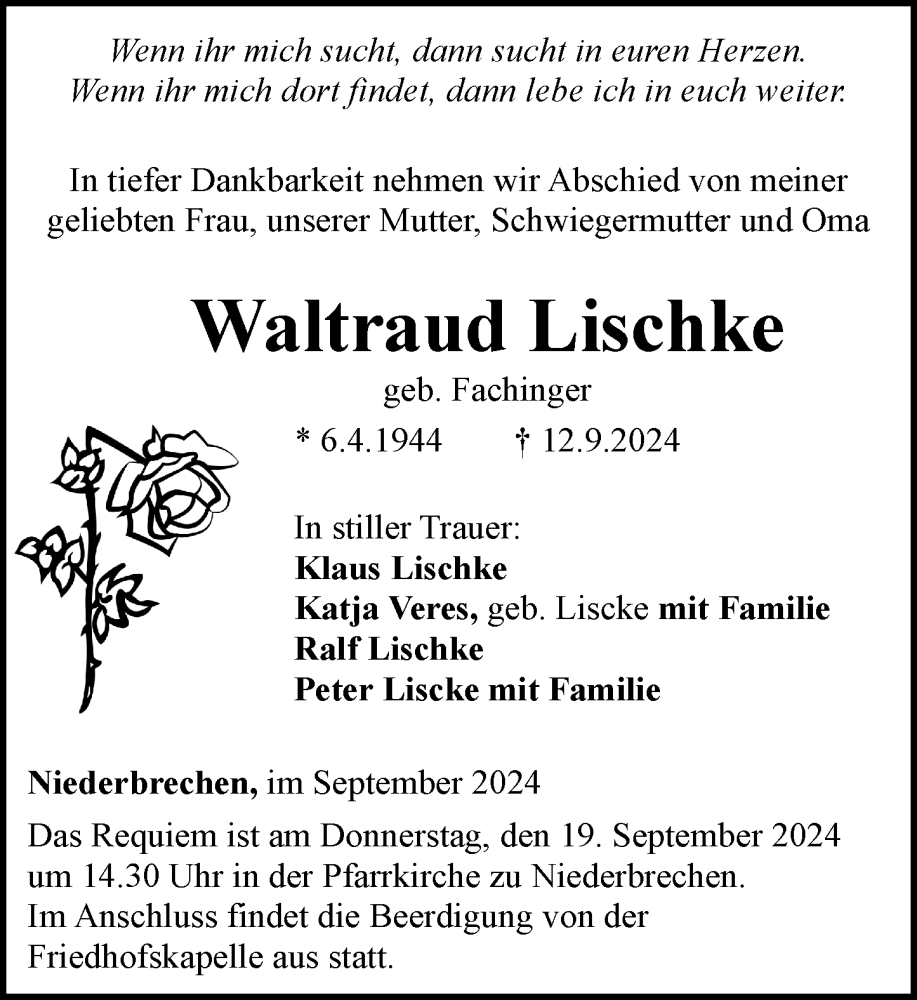 Hier finden Sie alle Traueranzeigen aus der Zeitung, die bisher für Waltraud Lischke erschienen sind. Weitere Traueranzeigen, die in der Zeitung erscheinen, werden hier ebenfalls aufgelistet