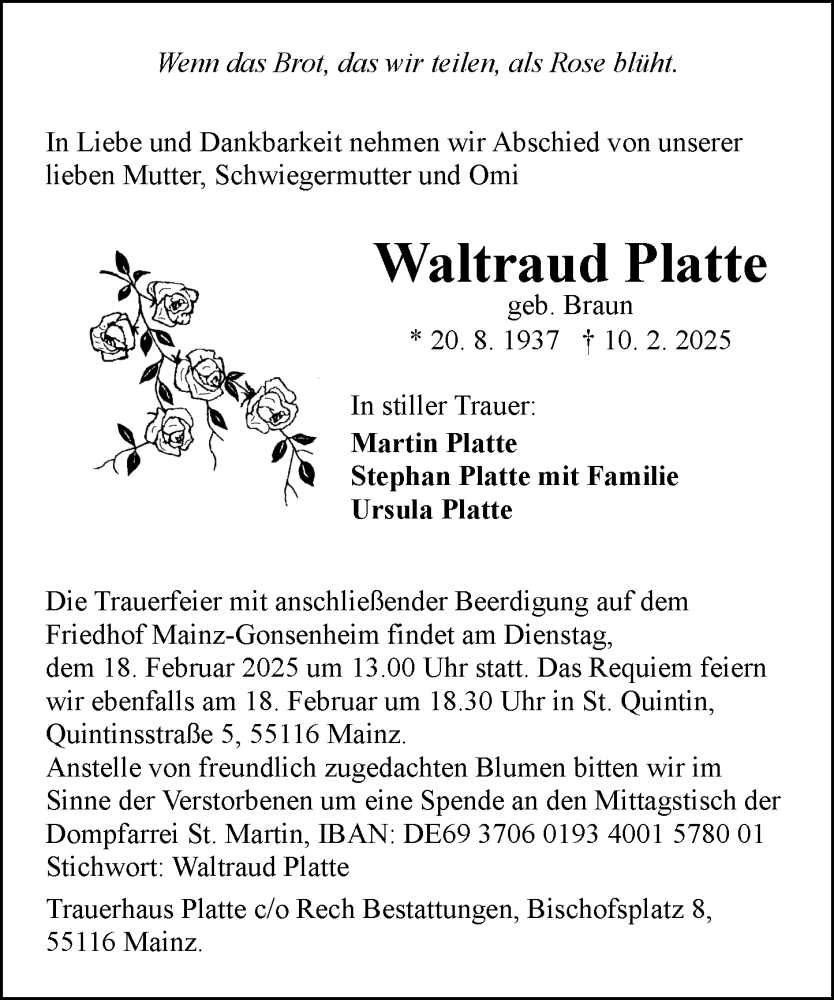 Hier finden Sie alle Traueranzeigen aus der Zeitung, die bisher für Waltraud Platte erschienen sind. Weitere Traueranzeigen, die in der Zeitung erscheinen, werden hier ebenfalls aufgelistet