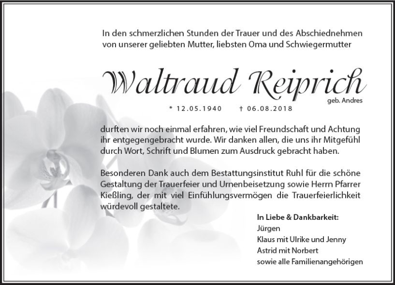 Hier finden Sie alle Traueranzeigen aus der Zeitung, die bisher für Waltraud Reiprich erschienen sind. Weitere Traueranzeigen, die in der Zeitung erscheinen, werden hier ebenfalls aufgelistet