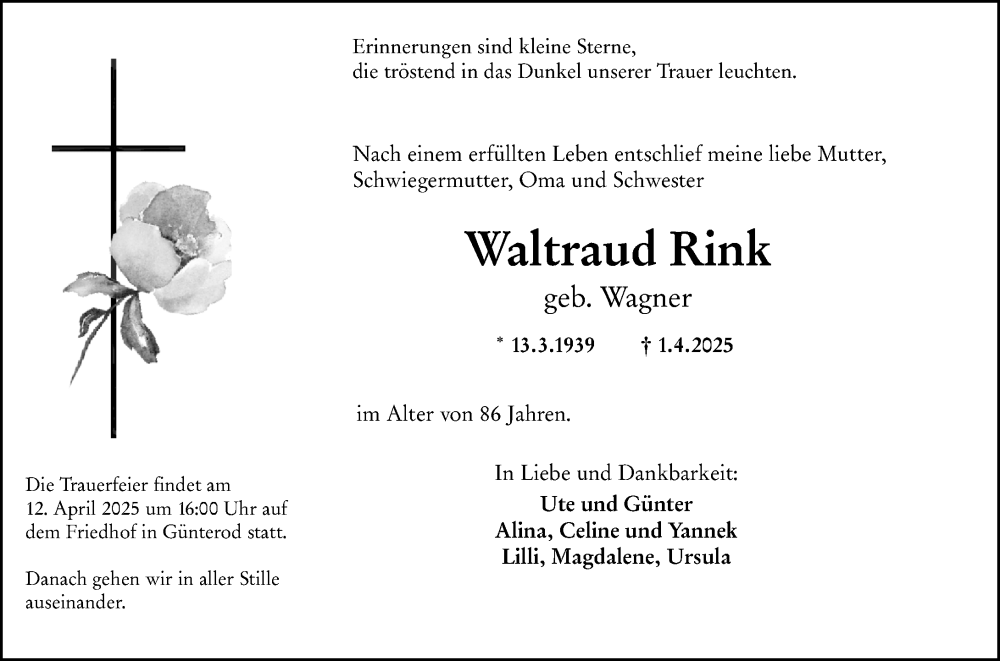 Hier finden Sie alle Traueranzeigen aus der Zeitung, die bisher für Waltraud Rink erschienen sind. Weitere Traueranzeigen, die in der Zeitung erscheinen, werden hier ebenfalls aufgelistet