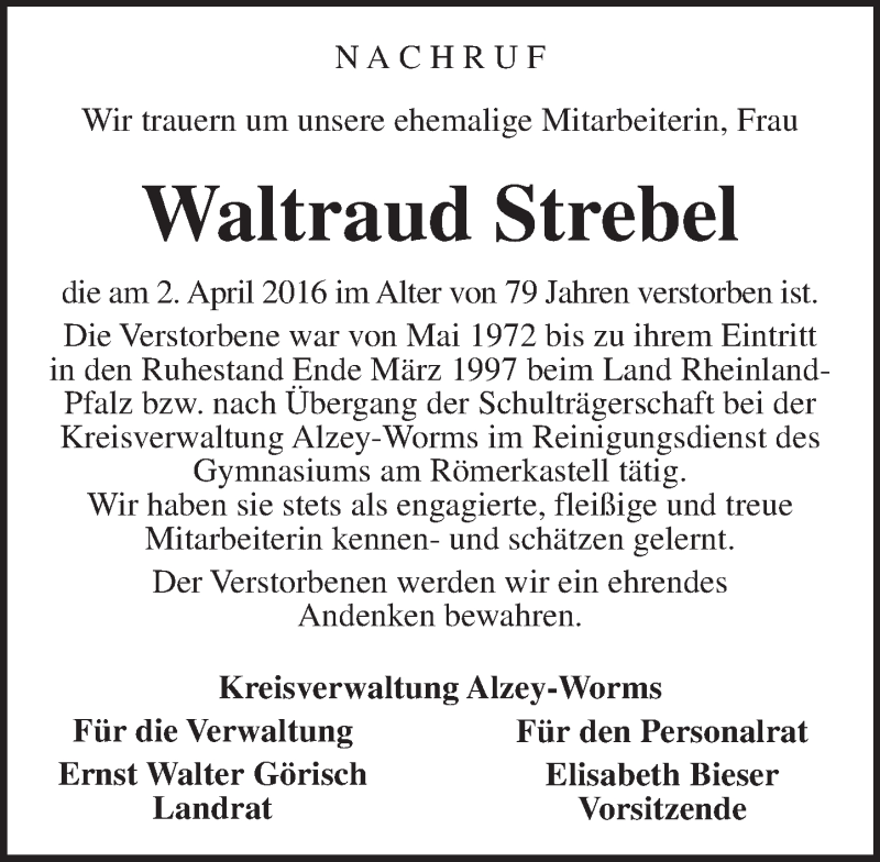 Hier finden Sie alle Traueranzeigen aus der Zeitung, die bisher für Waltraud Strebel erschienen sind. Weitere Traueranzeigen, die in der Zeitung erscheinen, werden hier ebenfalls aufgelistet