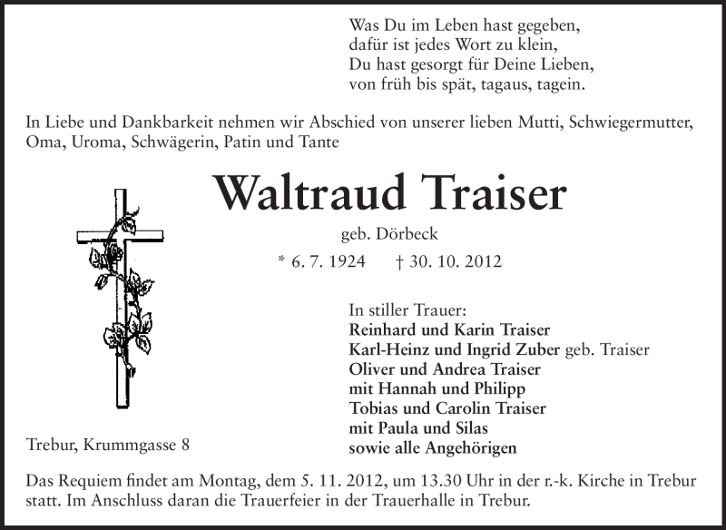 Hier finden Sie alle Traueranzeigen aus der Zeitung, die bisher für Waltraud Traiser erschienen sind. Weitere Traueranzeigen, die in der Zeitung erscheinen, werden hier ebenfalls aufgelistet