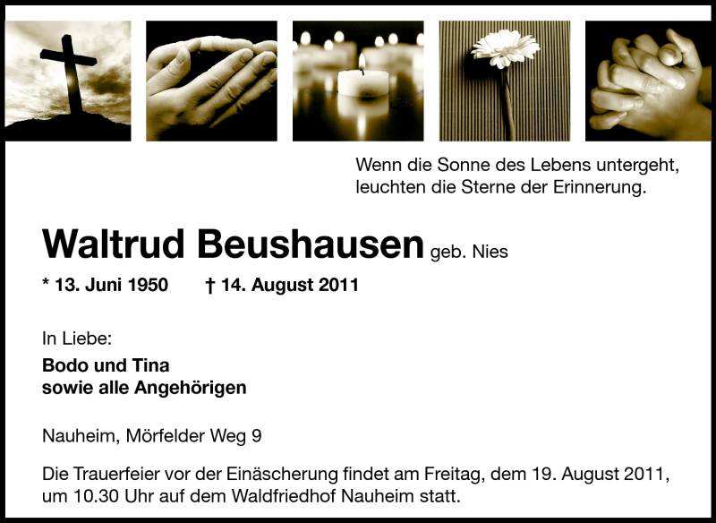 Hier finden Sie alle Traueranzeigen aus der Zeitung, die bisher für Waltrud Beushausen erschienen sind. Weitere Traueranzeigen, die in der Zeitung erscheinen, werden hier ebenfalls aufgelistet