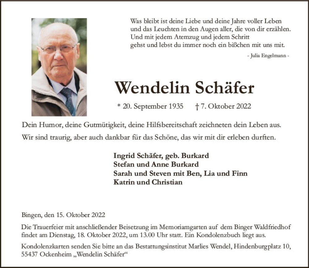 Hier finden Sie alle Traueranzeigen aus der Zeitung, die bisher für Wendelin Schäfer erschienen sind. Weitere Traueranzeigen, die in der Zeitung erscheinen, werden hier ebenfalls aufgelistet