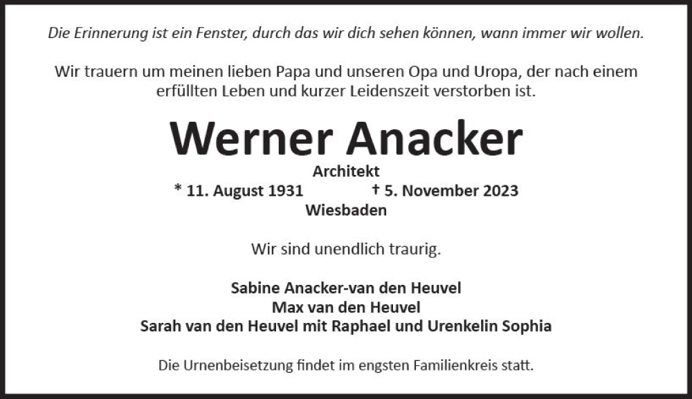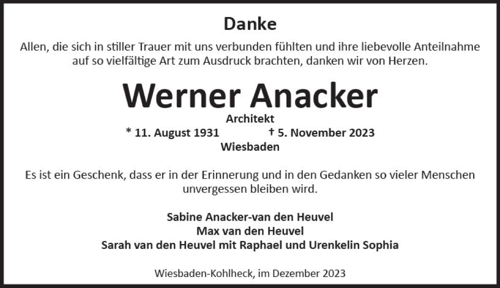 Hier finden Sie alle Traueranzeigen aus der Zeitung, die bisher für Werner Anacker erschienen sind. Weitere Traueranzeigen, die in der Zeitung erscheinen, werden hier ebenfalls aufgelistet