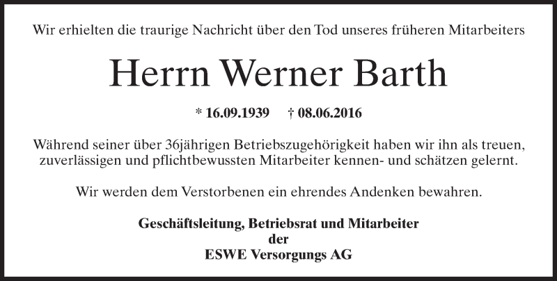 Hier finden Sie alle Traueranzeigen aus der Zeitung, die bisher für Werner Barth erschienen sind. Weitere Traueranzeigen, die in der Zeitung erscheinen, werden hier ebenfalls aufgelistet