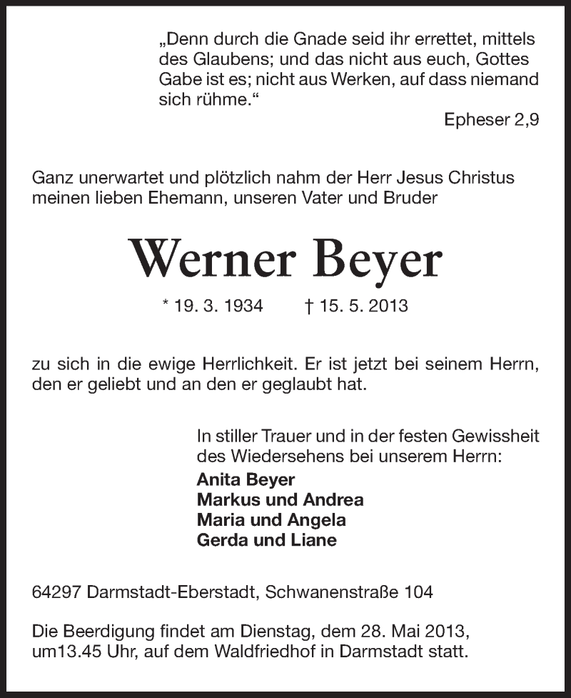 Hier finden Sie alle Traueranzeigen aus der Zeitung, die bisher für Werner Beyer erschienen sind. Weitere Traueranzeigen, die in der Zeitung erscheinen, werden hier ebenfalls aufgelistet