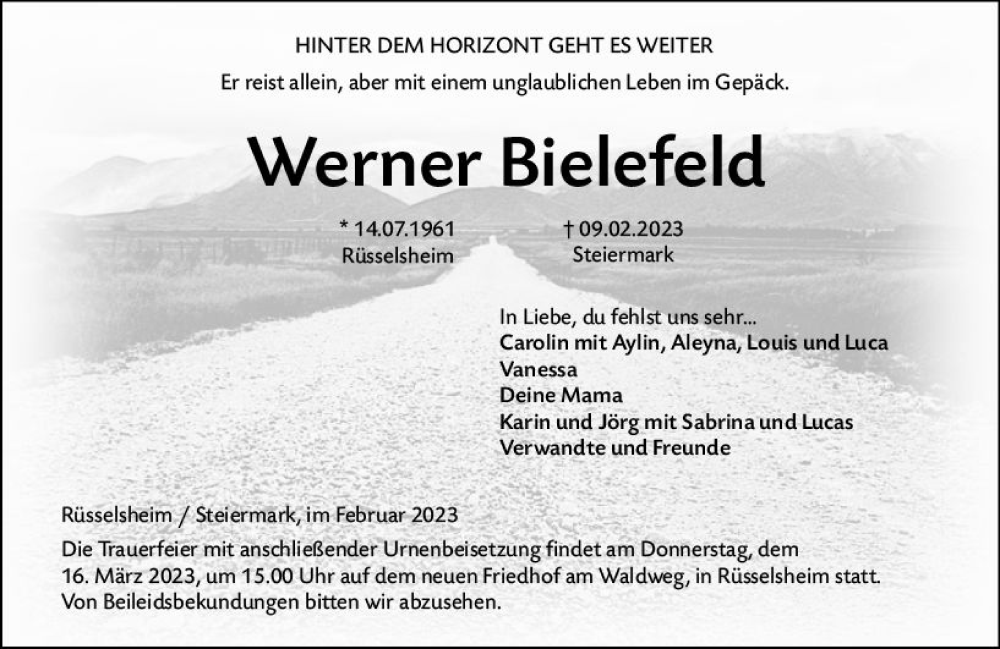 Hier finden Sie alle Traueranzeigen aus der Zeitung, die bisher für Werner Bielefeld erschienen sind. Weitere Traueranzeigen, die in der Zeitung erscheinen, werden hier ebenfalls aufgelistet
