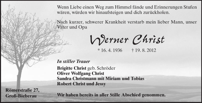 Hier finden Sie alle Traueranzeigen aus der Zeitung, die bisher für Werner Christ erschienen sind. Weitere Traueranzeigen, die in der Zeitung erscheinen, werden hier ebenfalls aufgelistet