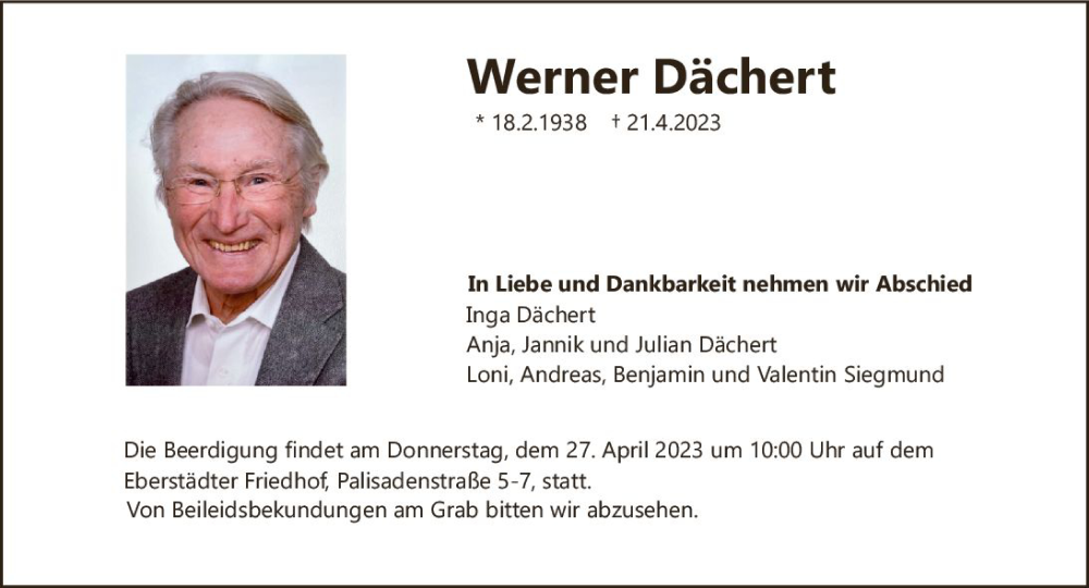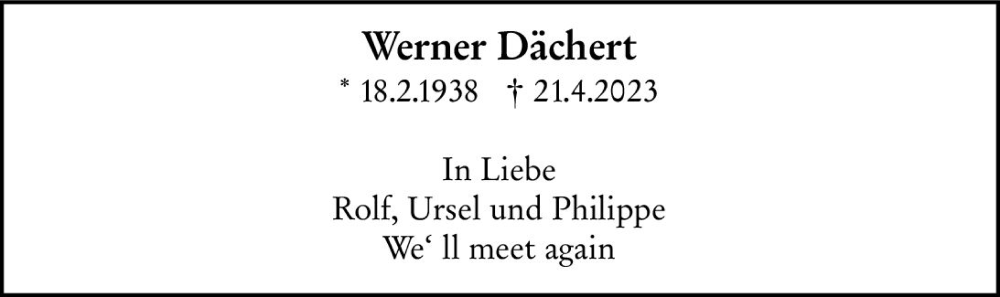 Hier finden Sie alle Traueranzeigen aus der Zeitung, die bisher für Werner Dächert erschienen sind. Weitere Traueranzeigen, die in der Zeitung erscheinen, werden hier ebenfalls aufgelistet