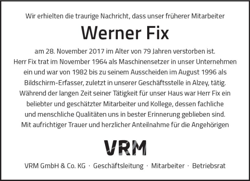 Hier finden Sie alle Traueranzeigen aus der Zeitung, die bisher für Werner Fix erschienen sind. Weitere Traueranzeigen, die in der Zeitung erscheinen, werden hier ebenfalls aufgelistet