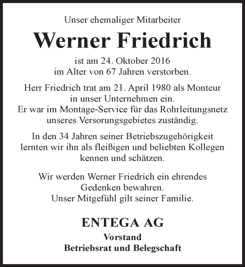 Hier finden Sie alle Traueranzeigen aus der Zeitung, die bisher für Werner Friedrich erschienen sind. Weitere Traueranzeigen, die in der Zeitung erscheinen, werden hier ebenfalls aufgelistet