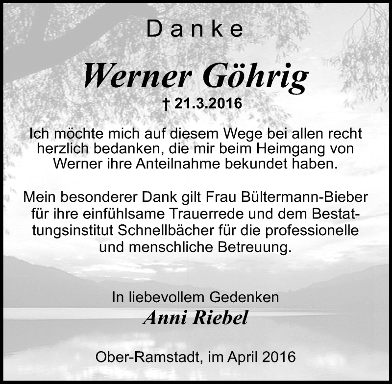 Hier finden Sie alle Traueranzeigen aus der Zeitung, die bisher für Werner Göhrig erschienen sind. Weitere Traueranzeigen, die in der Zeitung erscheinen, werden hier ebenfalls aufgelistet