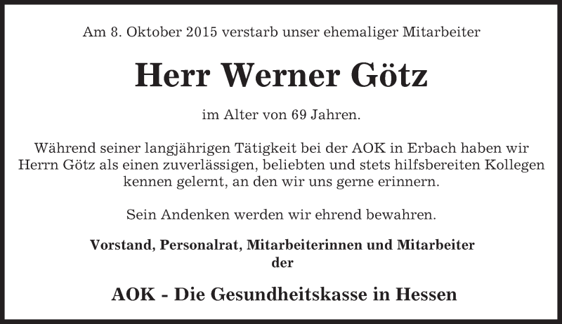 Hier finden Sie alle Traueranzeigen aus der Zeitung, die bisher für Werner Götz erschienen sind. Weitere Traueranzeigen, die in der Zeitung erscheinen, werden hier ebenfalls aufgelistet