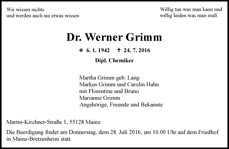 Hier finden Sie alle Traueranzeigen aus der Zeitung, die bisher für Werner Grimm erschienen sind. Weitere Traueranzeigen, die in der Zeitung erscheinen, werden hier ebenfalls aufgelistet