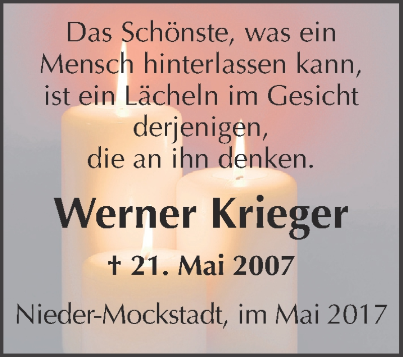 Hier finden Sie alle Traueranzeigen aus der Zeitung, die bisher für Werner Krieger erschienen sind. Weitere Traueranzeigen, die in der Zeitung erscheinen, werden hier ebenfalls aufgelistet