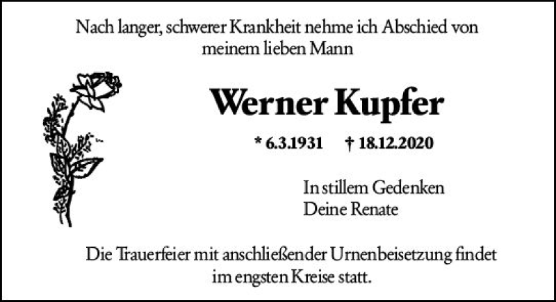 Hier finden Sie alle Traueranzeigen aus der Zeitung, die bisher für Werner Kupfer erschienen sind. Weitere Traueranzeigen, die in der Zeitung erscheinen, werden hier ebenfalls aufgelistet