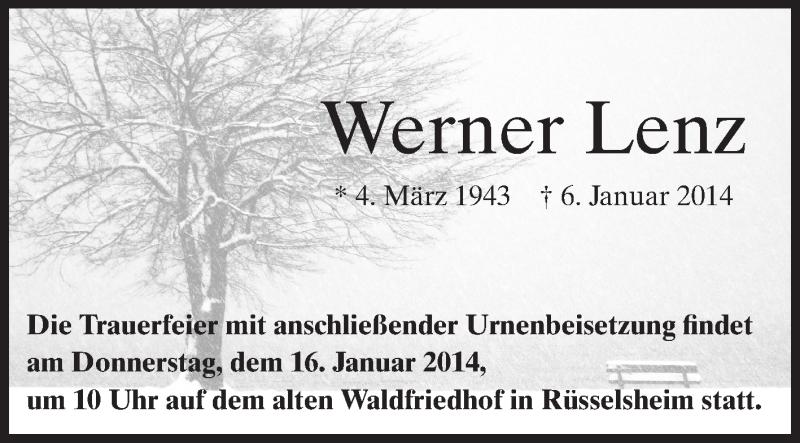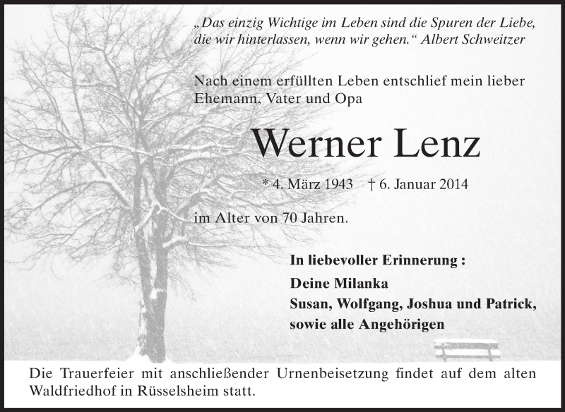 Hier finden Sie alle Traueranzeigen aus der Zeitung, die bisher für Werner Lenz erschienen sind. Weitere Traueranzeigen, die in der Zeitung erscheinen, werden hier ebenfalls aufgelistet