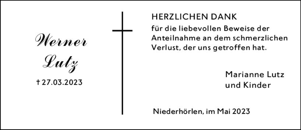 Hier finden Sie alle Traueranzeigen aus der Zeitung, die bisher für Werner Lutz erschienen sind. Weitere Traueranzeigen, die in der Zeitung erscheinen, werden hier ebenfalls aufgelistet