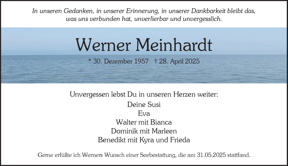 Hier finden Sie alle Traueranzeigen aus der Zeitung, die bisher für Werner Meinhardt erschienen sind. Weitere Traueranzeigen, die in der Zeitung erscheinen, werden hier ebenfalls aufgelistet