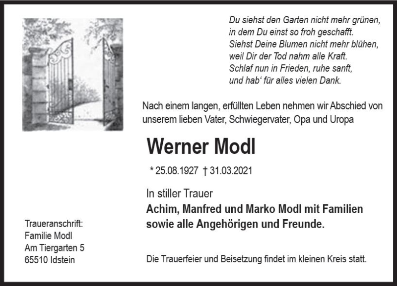 Hier finden Sie alle Traueranzeigen aus der Zeitung, die bisher für Werner Modi erschienen sind. Weitere Traueranzeigen, die in der Zeitung erscheinen, werden hier ebenfalls aufgelistet