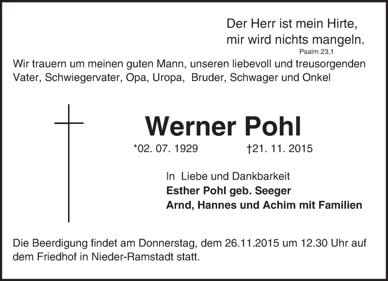 Hier finden Sie alle Traueranzeigen aus der Zeitung, die bisher für Werner Pohl erschienen sind. Weitere Traueranzeigen, die in der Zeitung erscheinen, werden hier ebenfalls aufgelistet
