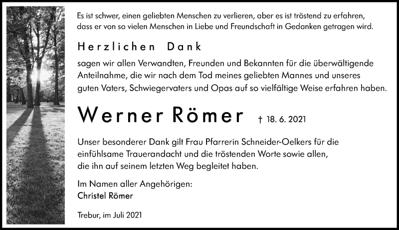 Hier finden Sie alle Traueranzeigen aus der Zeitung, die bisher für Werner Römer erschienen sind. Weitere Traueranzeigen, die in der Zeitung erscheinen, werden hier ebenfalls aufgelistet
