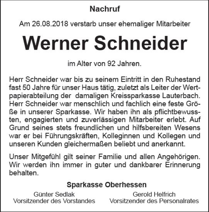 Hier finden Sie alle Traueranzeigen aus der Zeitung, die bisher für Werner Schneider erschienen sind. Weitere Traueranzeigen, die in der Zeitung erscheinen, werden hier ebenfalls aufgelistet
